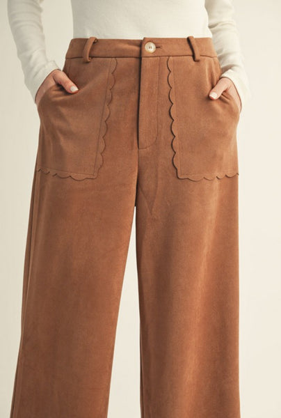 Wide leg suede pants with scallop edge accent, side pockets. Carmel
