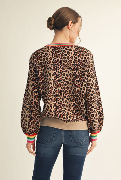 Long puff sleeves leopard sweater top with multi color neck binding and cuff, comfy & soft sweater.