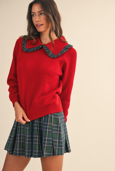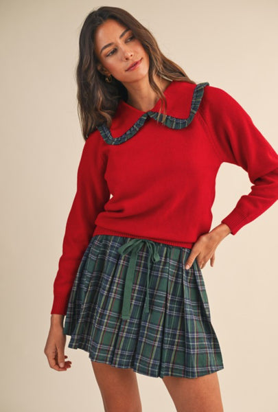 CHRISTMAS PLAID WOVEN RUFFLED COLLAR SWEATER