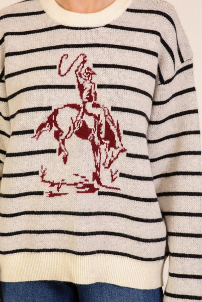 Saddle up for sweater season! Capture the free-spirited essence of the modern West with our standout Cowboy Sweater. This piece perfectly blends cozy comfort with on-trend western flair, featuring a classic striped pattern updated with a bold, intarsia-knit rodeo graphic at the front.