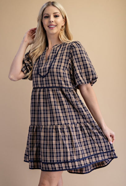 Plaid Tiered Puff Sleeve Mini Dress with Satin Binding Details. Navy blue