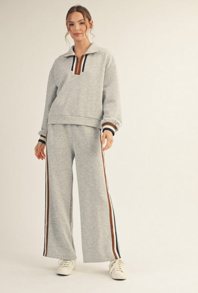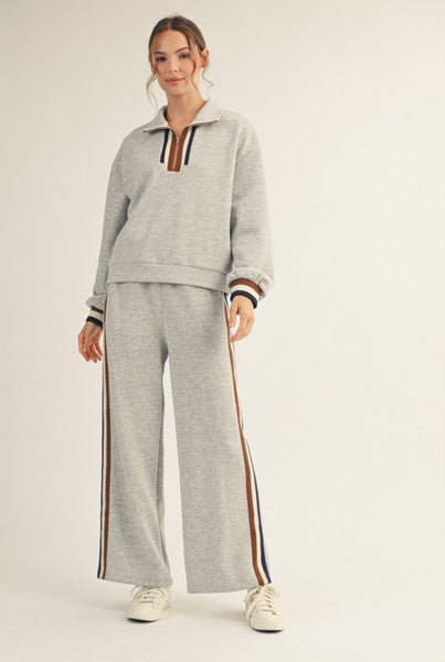 There are striped details at neckline, cuffs, and both sides of the pants.