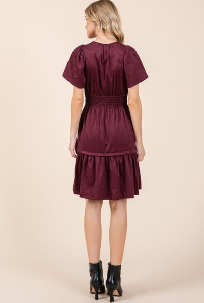 This dress features a soft, suede-like fabric that drapes beautifully. The bodice has a flattering smocked waist, creating a cinched silhouette. It also boasts a split neckline with a small button detail, adding a touch of sophistication. The short sleeves are cut in a flutter style, offering a romantic and airy feel. The skirt is tiered, with a ruffled hem that adds volume and movement, making it perfect for a variety of occasions. Wine