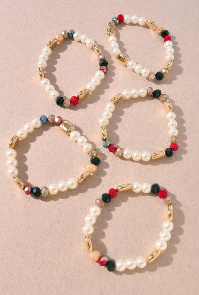 Pearl Multi Mixed Bead Bracelet Set. Stretch Bracelet set of 5. Red, Green, Black, Pearl Multi