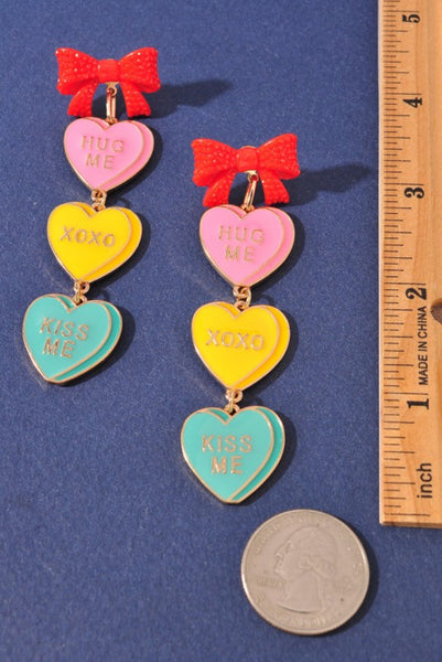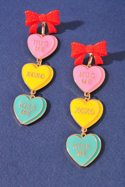 Tiered Hearts Earrings | Conversation Heart Earrings |Valentine's Day Jewelry | Cute Heart Drop Earrings | Bow Top Earrings | Colorful Statement Earrings | Holiday Boutique Accessories | Fun Fashion Jewelry | Sweetheart Earrings | Love Theme Earrings | Trendy Holiday Earrings | Playful Drop Earrings | Valentine Gift Jewelry | Cute Colorful Earrings | Festive Heart Jewelry