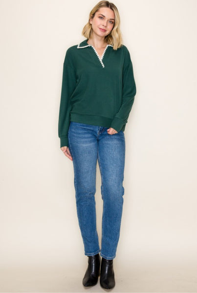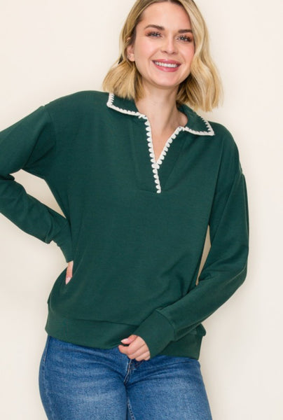 Contrast blanket stitched polo collar, long sleeve, solid knit top.  Emerald Green