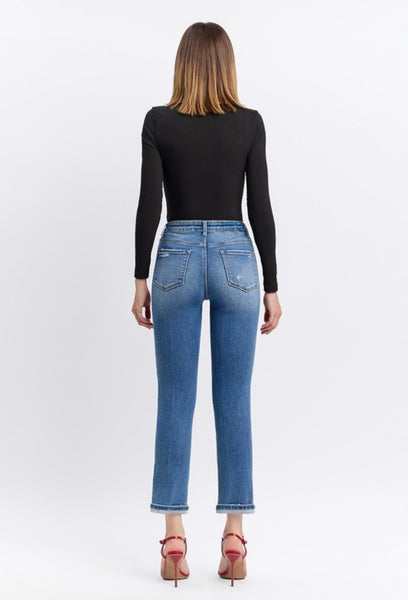 COMFORT STRETCH DENIM, HIGH RISE WAIST, LIGHTLY DISTRESSED DETAIL, SINGLE CUFF HEM, CROPPED LENGTH, SLIM STRAIGHT JEANS