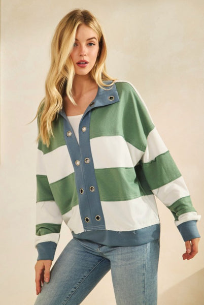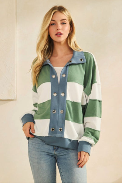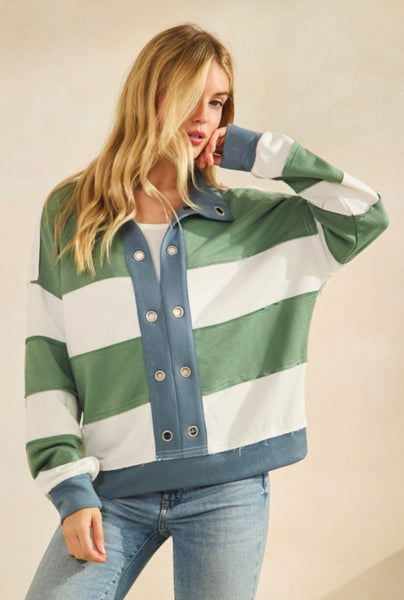 Product Details: EYELET BUCKLE RETRO STRIPE POPOVER COLLARED TOP