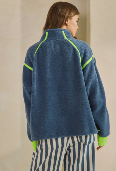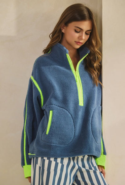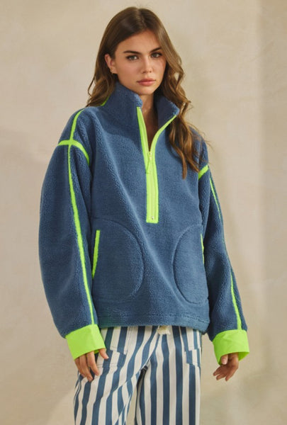 This top is a half-zip sherpa pullover that blends cozy texture with a bold, sporty edge. It features a deep blue fleece body contrasted by neon lime accents — including the zipper, seam piping, and inner cuffs. The design has a relaxed, oversized fit, zipper pockets, and a stand collar for extra warmth and structure.