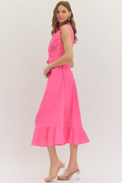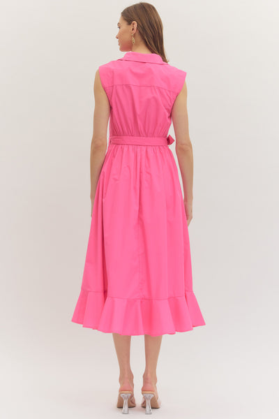 Sleeveless wrap shirt dress with twist detail and diagonal buttons.  Collared. Side pockets.  Solid.  Pink