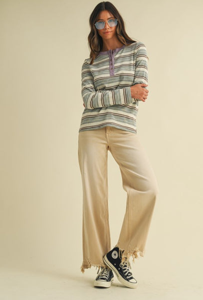 Multi Stripe Henley Neck Rib Knit Top. Dusty Blue