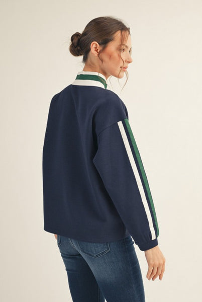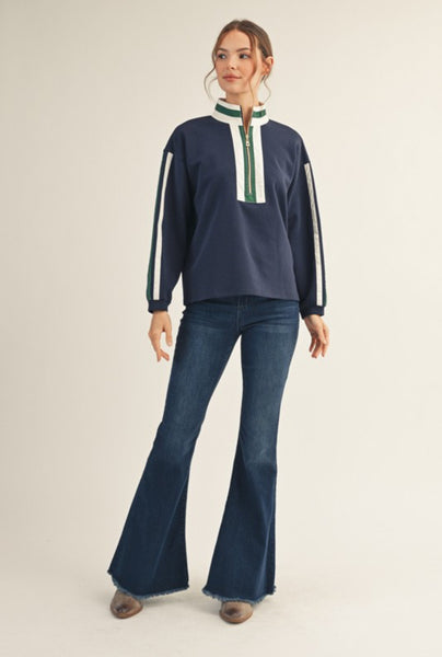 Drop shoulder zip up sweatshirt with solid contrast detail, mock neck. Navy blue