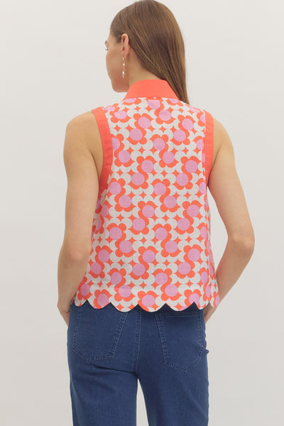 Floral print sleeveless top with solid trim v-neckline, arm holes and center seam with a scalloped hem. Woven. Non-sheer. Lightweight. Coral