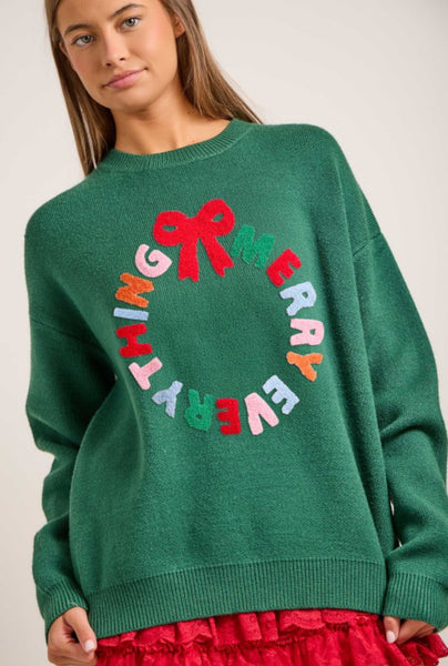 Merry Everything Christmas Wreath Sweater. Dark Green