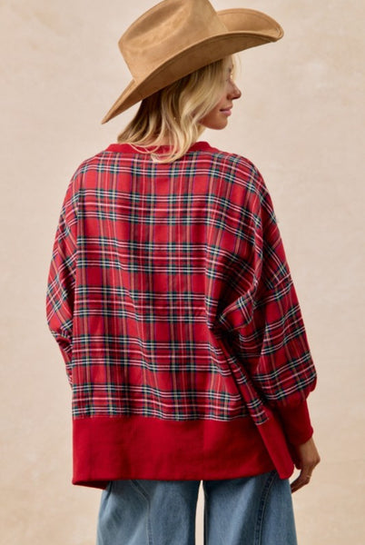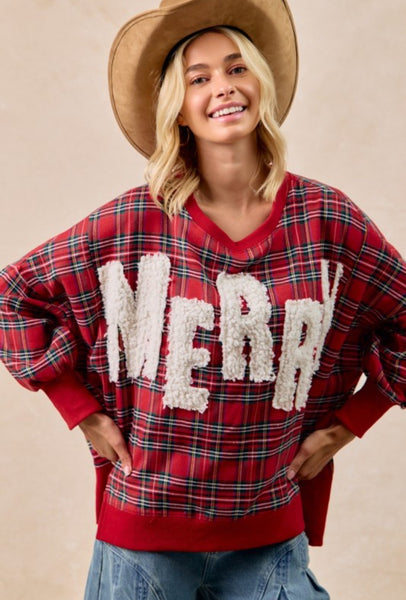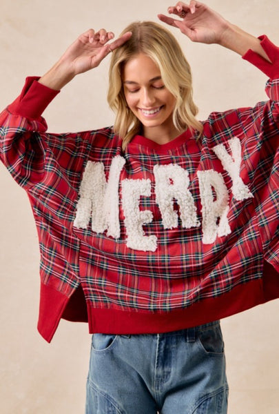 Merry Letter Patches Christmas Plaid Cut Edge Detail Oversized Sweatshirt. Red