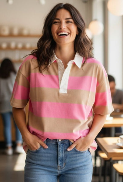 RUGBY STRIPED, HALF SLEEVE, OVERSIZED POLO SHIRT