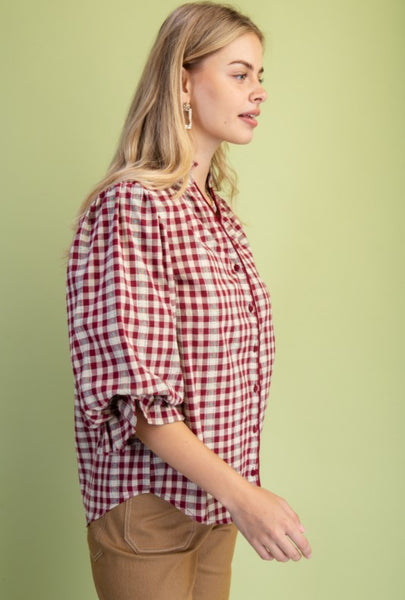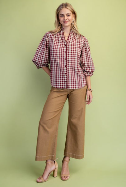 Check Print Button Down with 3/4 Length Gathered Balloon Sleeves and a Rounded Back Yoke. Wine