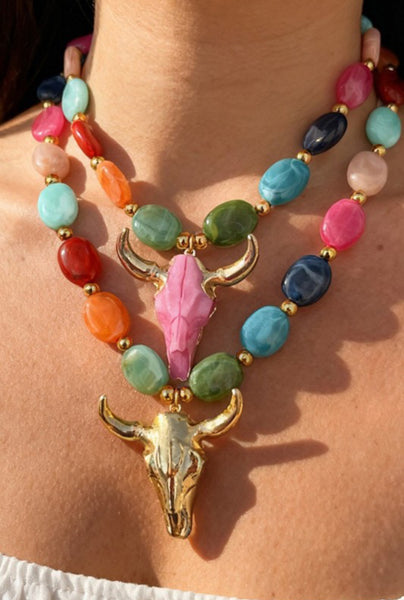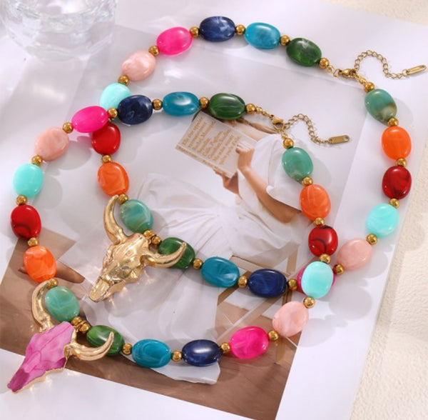 Beaded Bull Head Titanium Steel Multicolored Necklace. Gold bull head pendant. 18” long