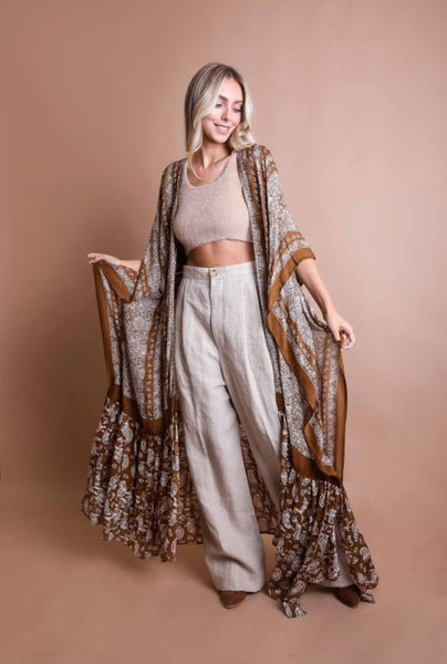 Behold the effortless elegance of our Free Flow Paisley Longline Kimono. With its expansive dimensions of 55" x 44" and a generous 24" armhole, this kimono is the epitome of breezy sophistication. The intricate paisley pattern infuses an aura of timeless style. Ideal for layering over a casual outfit or adding a dash of glamour to an evening ensemble, this kimono offers versatility and flair. Available in wholesale packs of 6, it's ready for immediate shipping to meet your fashion needs. Black or Brown